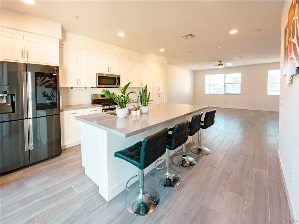 RARE & BEAUTIFUL property with 4 beds, 3.5 bath located in an established neighborhood which close to Disneyland, Angels Stadium and the Outlets, and within short distance of restaurant and shopping. Centrally located to 22, 5 & 57 freeways. 3 Stories property -Ground floor: 1 master suite with its own bath room & direct access to the garage and front patio -Second floor: Open concept living space facing a private deck, kitchen features a large island with stainless steel sink, storage cabinets. Laundry room fit a washer and dryer side by side with added sink and extra storage. -Third Floor: 1 master bed room features a walk-in closet and its owns bathroom and two guest bedrooms which are well sized living spaces with standard closets and share the full hallway bathroom. Central Air and Heat.